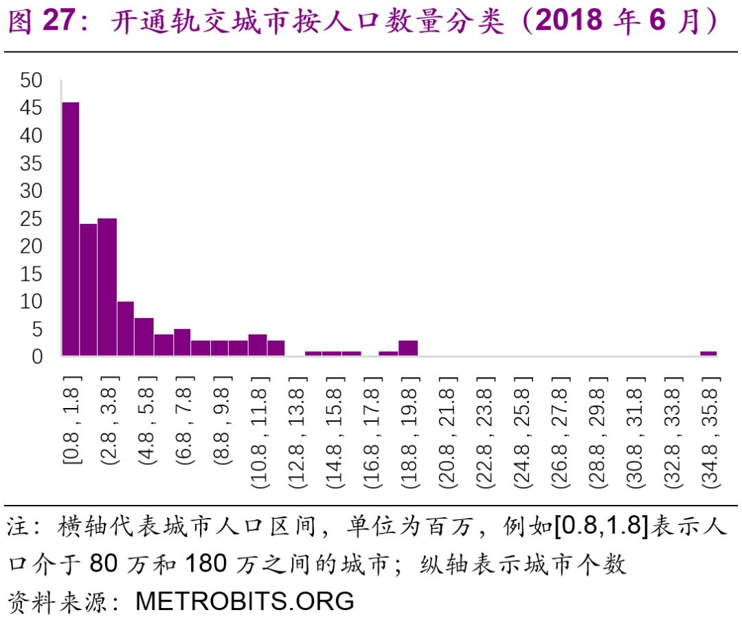 擬建地鐵、輕軌線路初期客運(yùn)強(qiáng)度分別不低于每日每公里0.7萬人次、0.4萬人次,遠(yuǎn)期客流規(guī)模分別達(dá)到單向高峰小時(shí)3萬人次以上、1萬人次以上。但是同時(shí)也強(qiáng)調(diào)了:“以上申報(bào)條件將根據(jù)經(jīng)濟(jì)社會(huì)發(fā)展情況按程序適時(shí)調(diào)整?!?016年,中國(guó)城市中市區(qū)常住人口在150萬以上的城市共有111個(gè),對(duì)比目前已經(jīng)開通軌道交通的城市數(shù)量(34個(gè)),仍有一定的發(fā)展空間。而從國(guó)際上看,建設(shè)軌道交通的城市人口的起點(diǎn)[19]大約為100萬(圖27),如果長(zhǎng)期內(nèi)中國(guó)將建設(shè)軌道交通的人口標(biāo)準(zhǔn)下調(diào)至100萬,那么將有225個(gè)城市符合標(biāo)準(zhǔn)(圖28)。