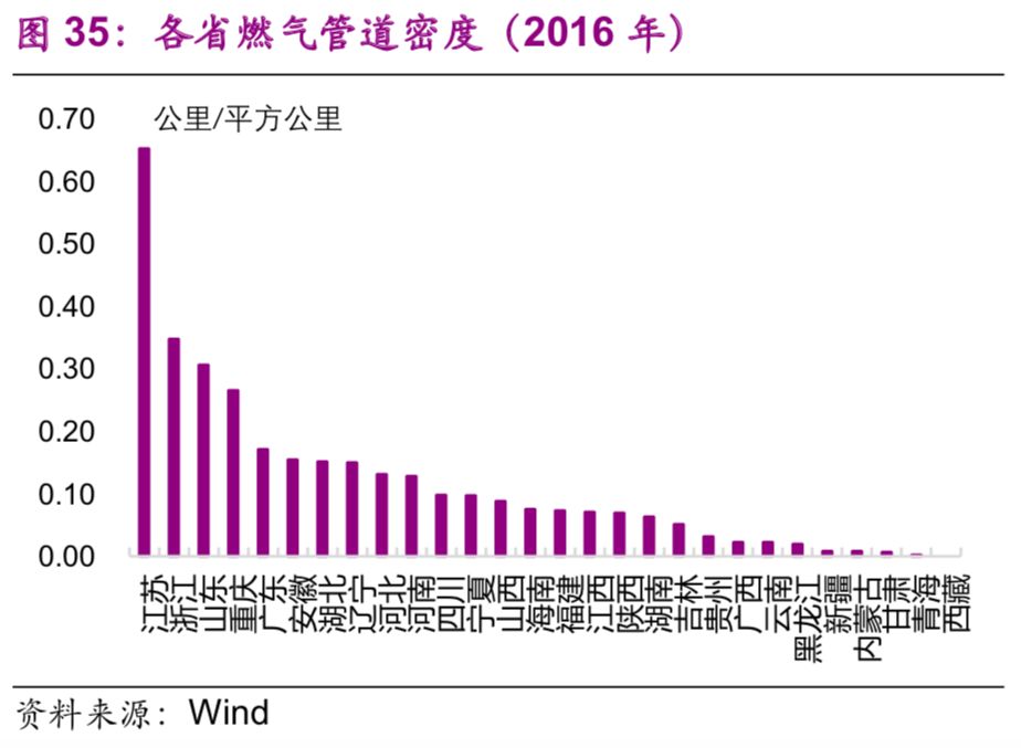 能源基礎(chǔ)設(shè)施方面,東部地區(qū)普遍高于中西部地區(qū)。2016年,燃?xì)夤艿烂芏扰琶叭氖墙K(0.65公里/平方公里)、浙江(0.35公里/平方公里)、山東(0.31公里/平方公里)(圖35);人均燃?xì)夤艿繹22]排名前三的也是浙江(8.4公里/萬人)、寧夏(7.5公里/萬人)、重慶(7.2公里/萬人)(圖36)。