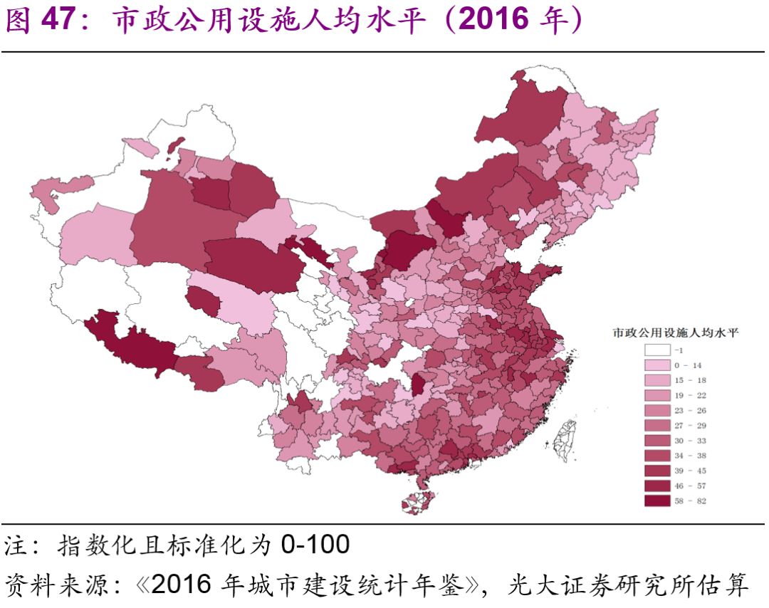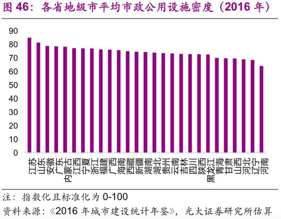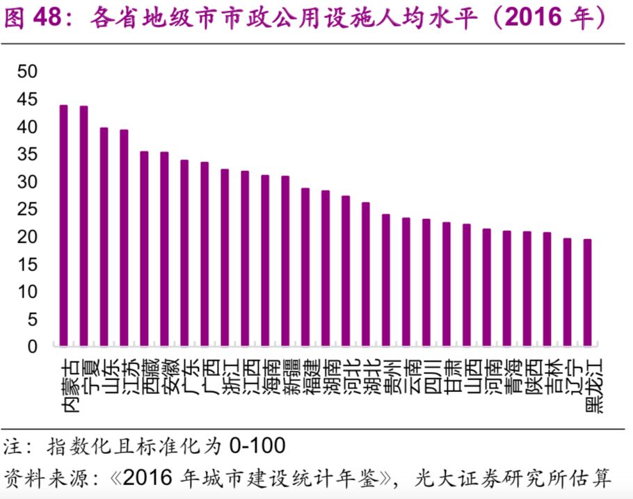 城市市政公用設(shè)施投資結(jié)構(gòu)不斷變化。隨著中國(guó)城鎮(zhèn)化的不斷推進(jìn),2016年投資額達(dá)1.7萬億元的城市市政公用設(shè)施投資結(jié)構(gòu)有了較大變化:1990年占據(jù)較大比重的燃?xì)猓?6%)、供水(20%)隨著滲透率觸及“天花板[26]”后比重下降較快,兩者2016年的比重分別為2%、3%;而更能體現(xiàn)城市功能升級(jí)的公共交通、道路橋梁等的比重上升較快,1990年兩者的比重分別為8%、26%,2016年則分別為23%、43%;此外,許多新型的城市市政公用設(shè)施投資開始出現(xiàn),例如地下綜合管廊,2016年占比達(dá)到了1.7%(圖44)。